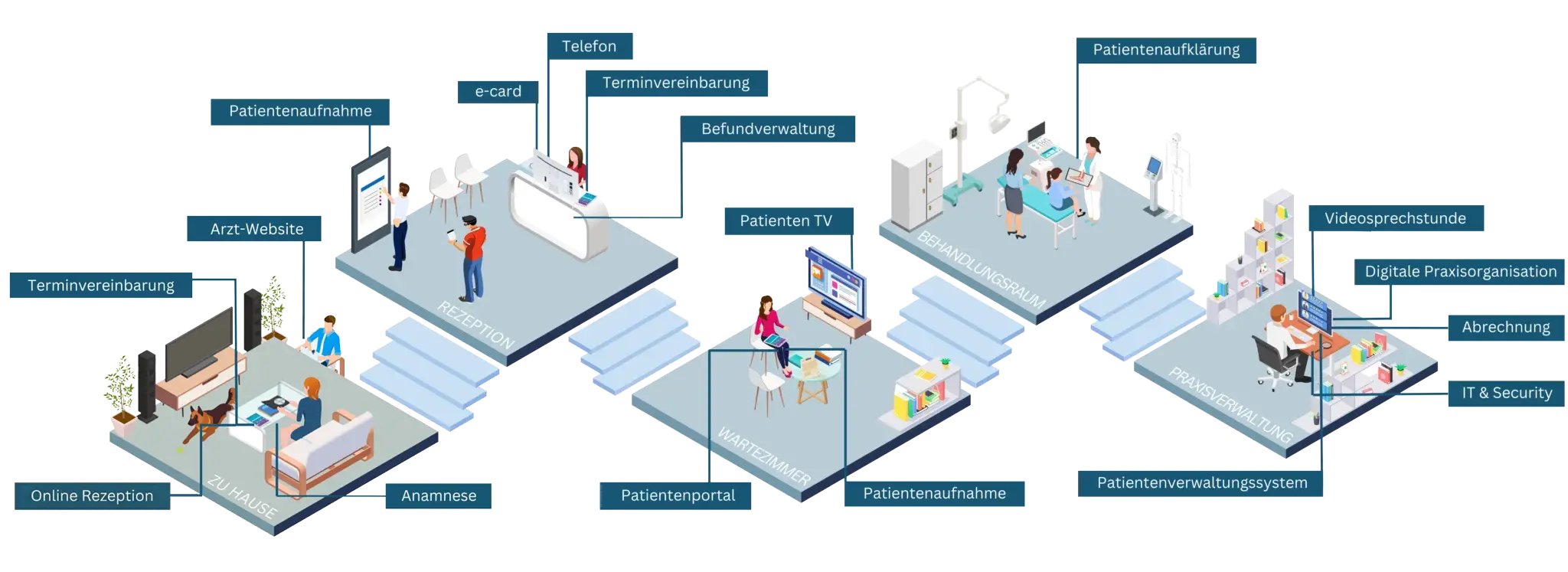 Finden Sie die richtigen Digitalisierungsschritte genau an Ihre Arztpraxis angepasst. Klicken Sie auf den gewünschten Arbeitsschritt und finden Sie den richtigen Lösungspartner.